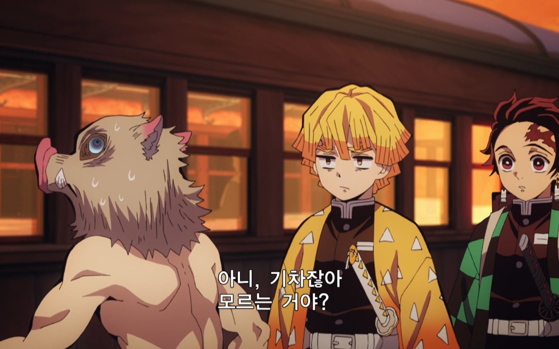 가운데 노란 머리빛의 화려한 오렌지빛의 소년은 '젠이치' 벼락의 호흡으로 칼을 다룬다. 이노츠케는 짐승의 호흡. 아직도 잘 모르겠지만, 귀살대원은 칼을 받게 되고 그 칼날의 색은 다 다르다. 호흡을 굉장히 중요시 하며 각 스승에게 전수 받은 듯하다. 홀로 숲에서 자란 짐승의 호흡, 젠이치는 벼락을 다루는 스승으로 벼락의 호흡.